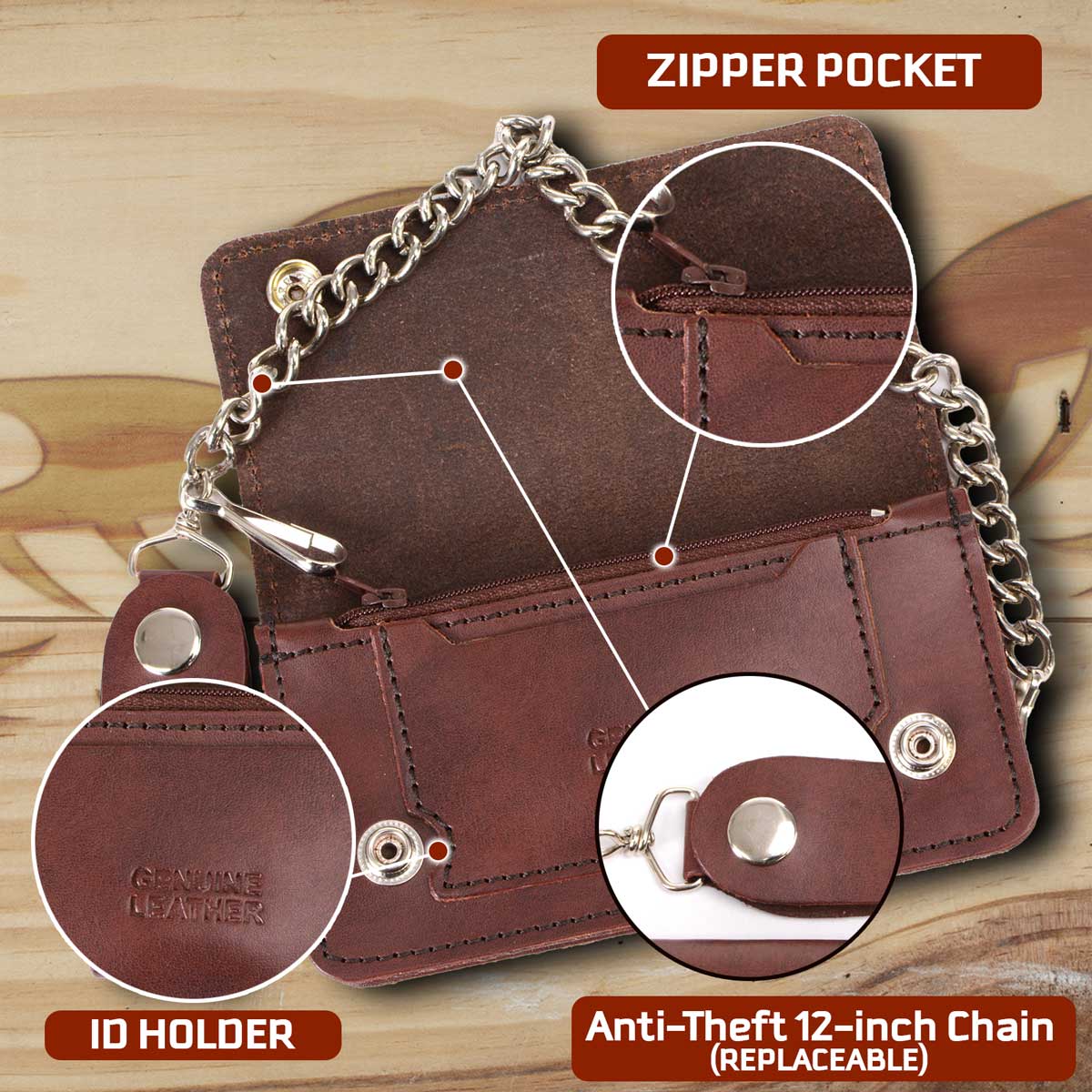 Milwaukee Leather MLW7884 Men's 6 Inch Antique Brown Leather Bi-Fold Biker Wallet w/ Anti-Theft Stainless Steel Chain
