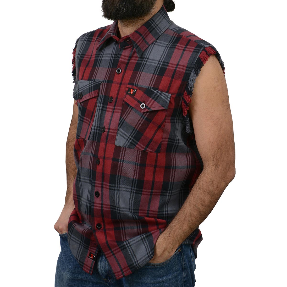 Milwaukee Leather MNG11696 Men’s Classic Black and Grey with Red Button-Down Flannel Cut Off Frayed Sleeveless Casual Shirt