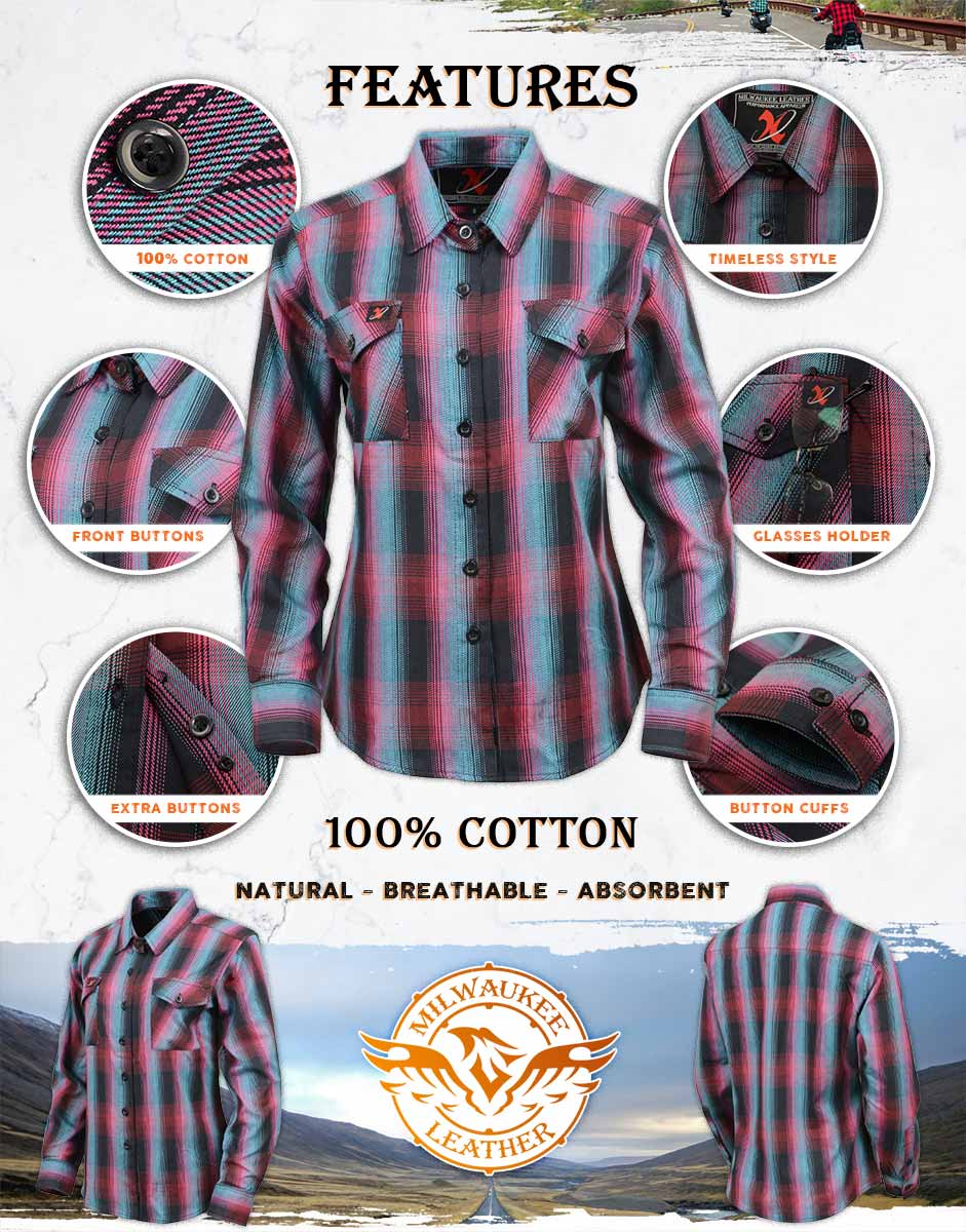 Milwaukee Leather MNG21612 Women's Black and Pink with Blue Long Sleeve Cotton Flannel Shirt