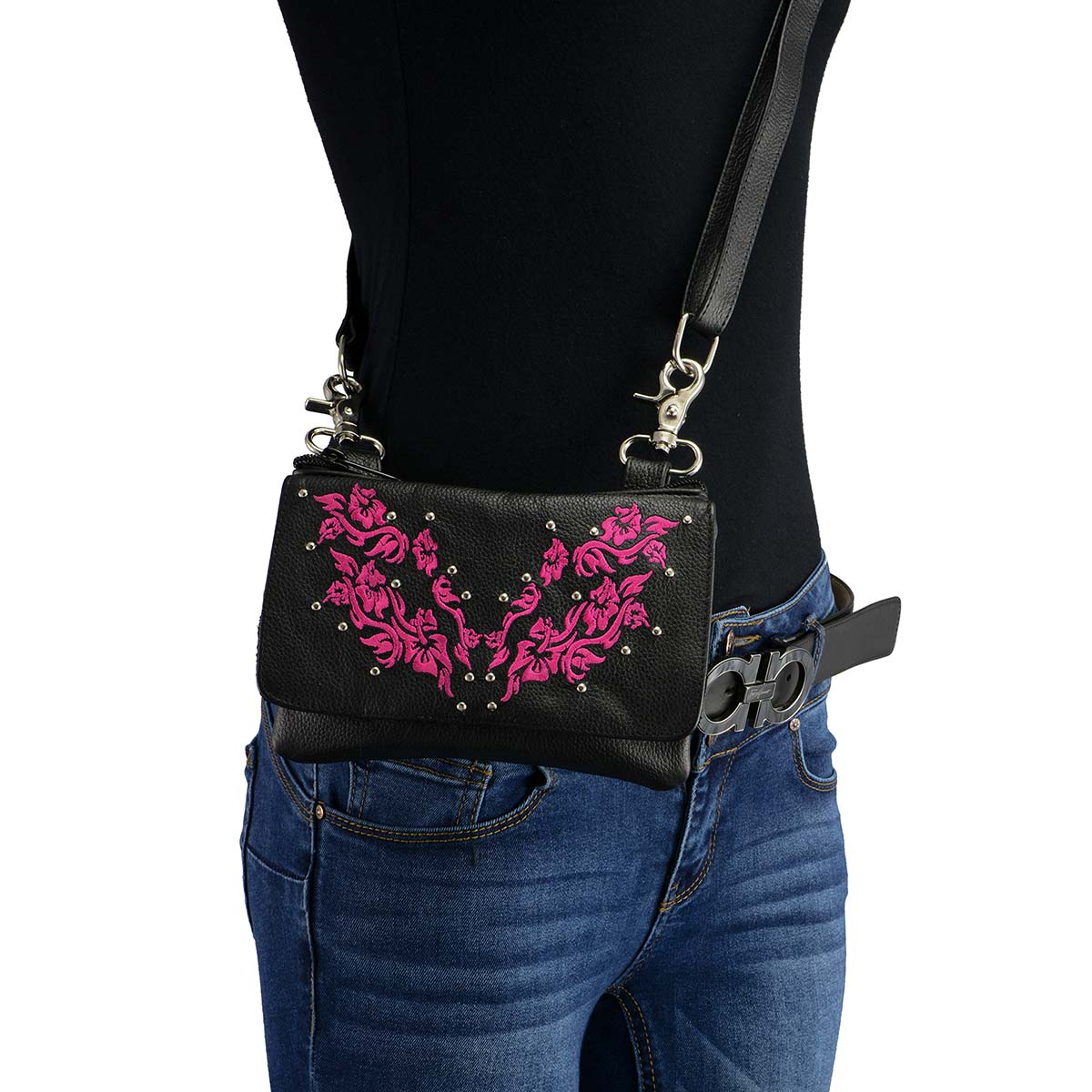 Milwaukee Leather MP8853 Women's 'Flower' Black and Pink Leather Multi Pocket Belt Bag
