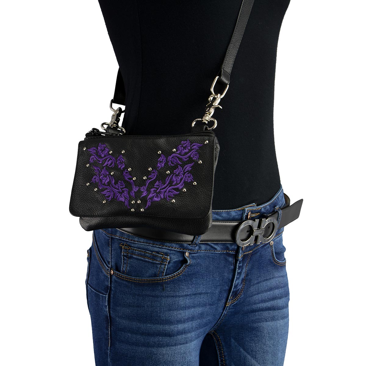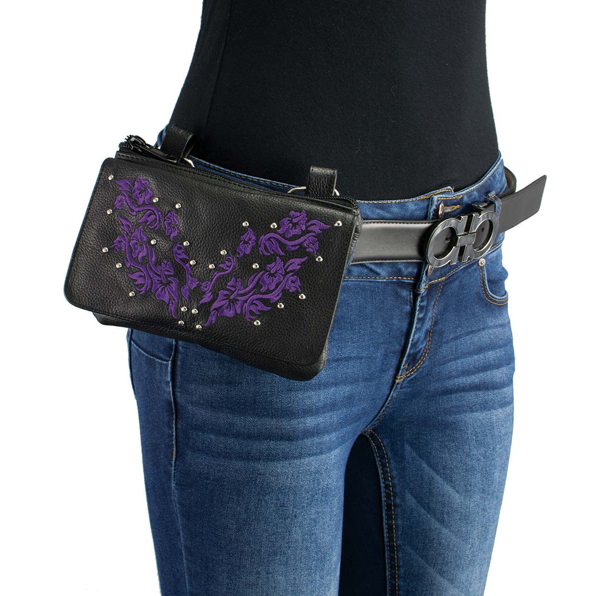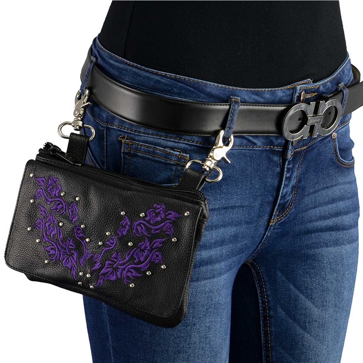 Milwaukee Leather MP8853 Women's 'Flower' Black and Purple Leather Multi Pocket Belt Bag