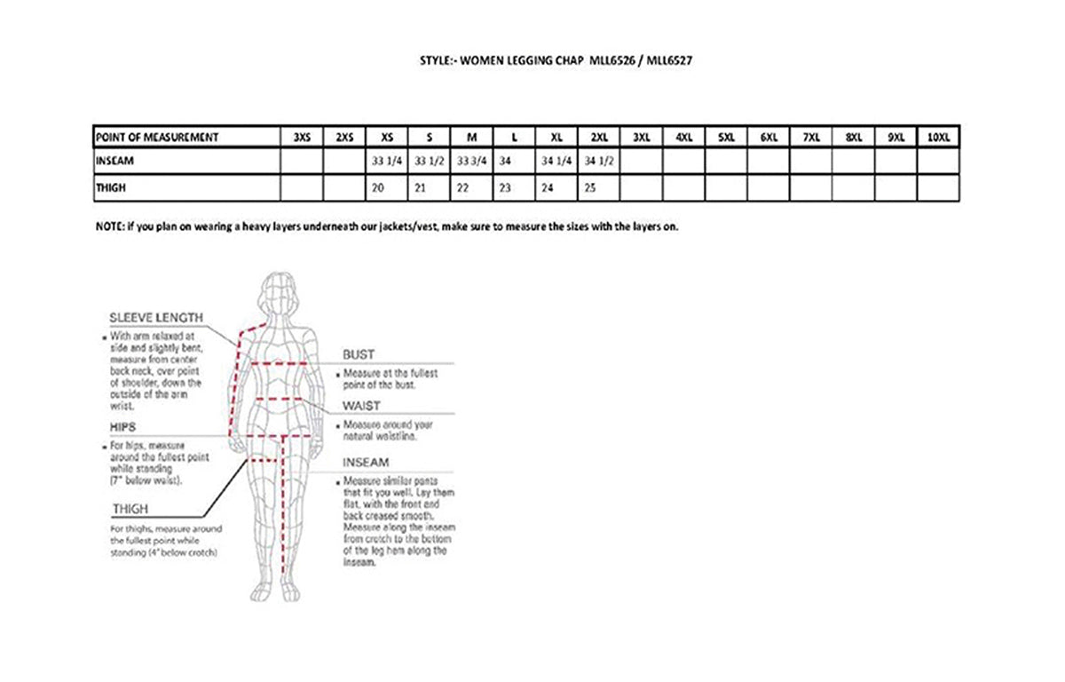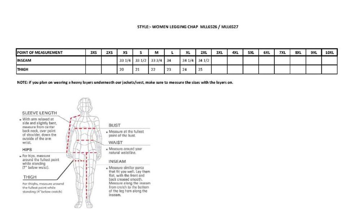 • Ladies leather can run two sizes smaller – measure your chest size!