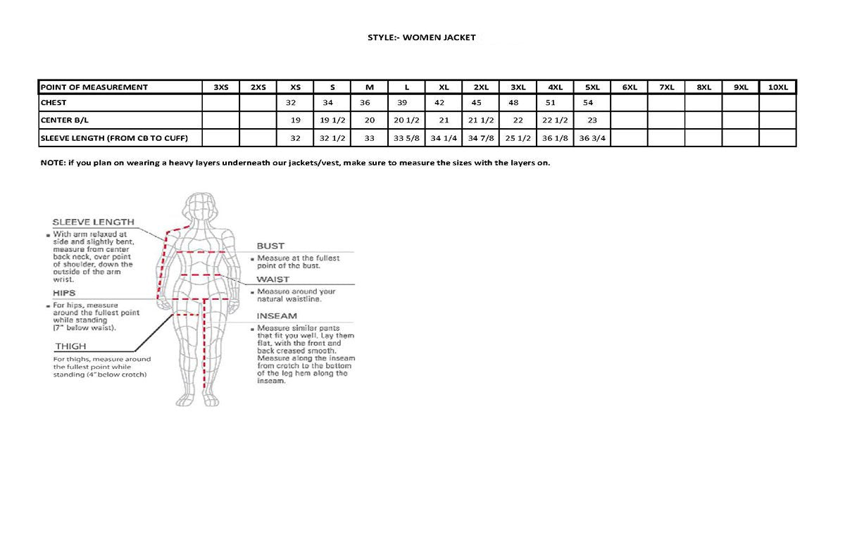 - Ladies leather can run two sizes smaller – measure your chest size!