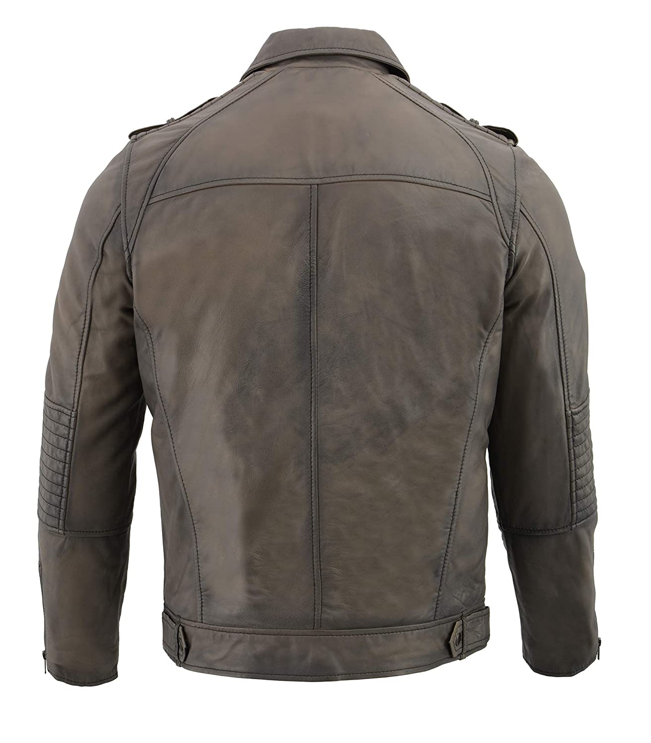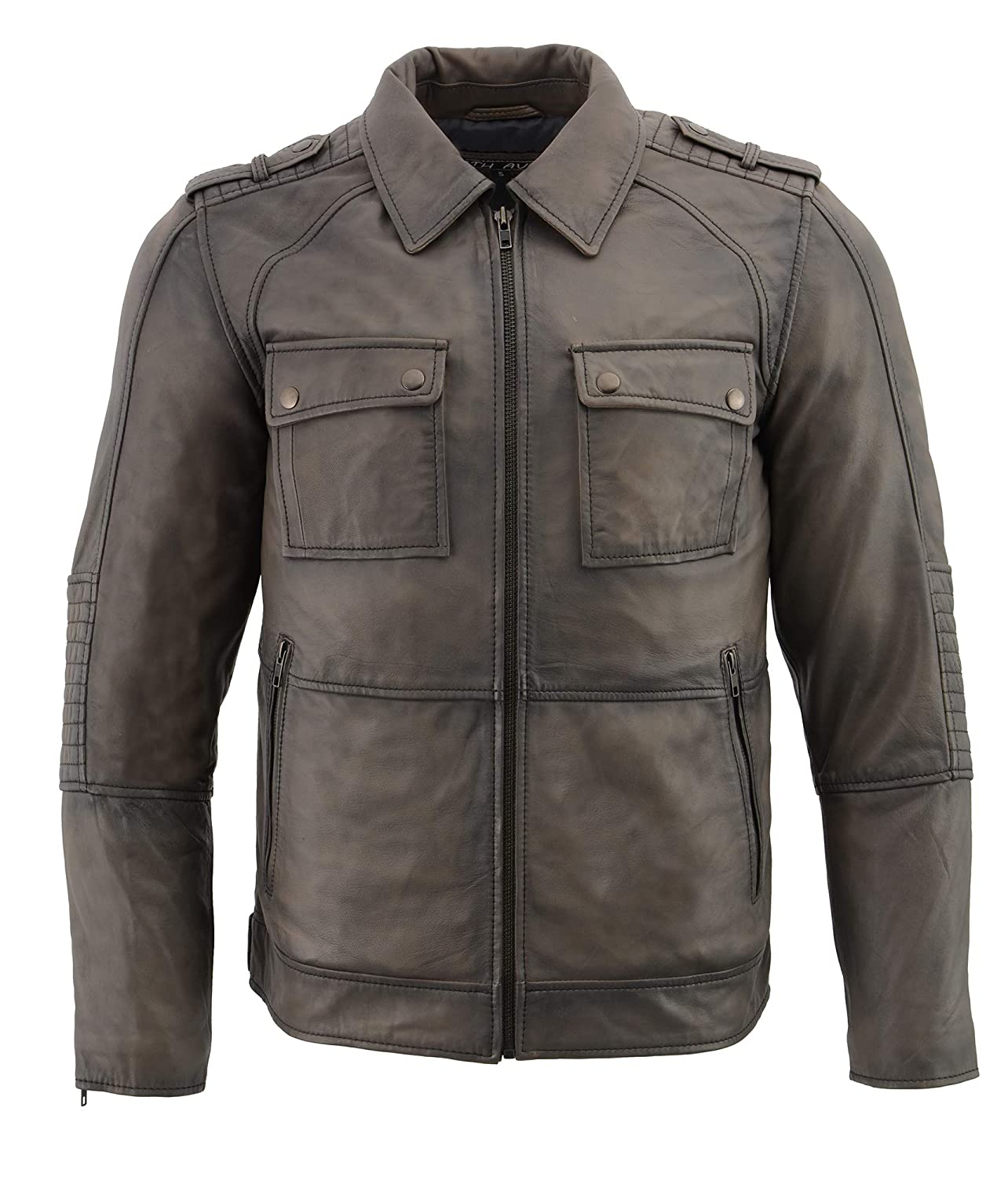 Enjoy the classic appeal and modern detailing of this mens leather jacket. With several pockets, a comfortable fit, and padded elbows, this leather jacket showcases a masculine design and is constructed from lambskin. Available in your choice of grey or black, it is suitable for any occasion.