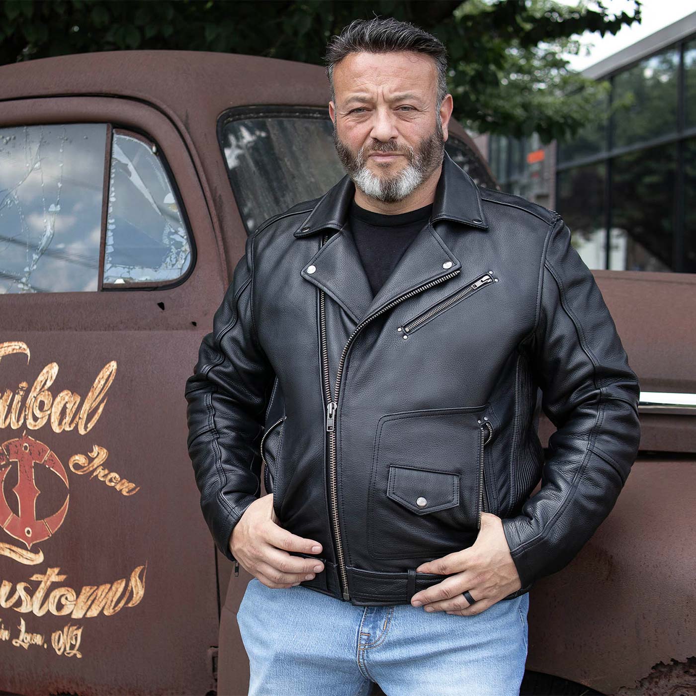 The Unforgiven Leather Jacket doesn’t play nice. It’s a hard-hitting nod to the rebellious classics—crafted from 1.2–1.3mm drum-dyed, full-grain naked cowhide for a lived-in feel and lasting durability. The asymmetrical front zip delivers that unmistakable vintage moto look, while accordion stretch side panels give you all-day ride comfort without losing that aggressive fit.