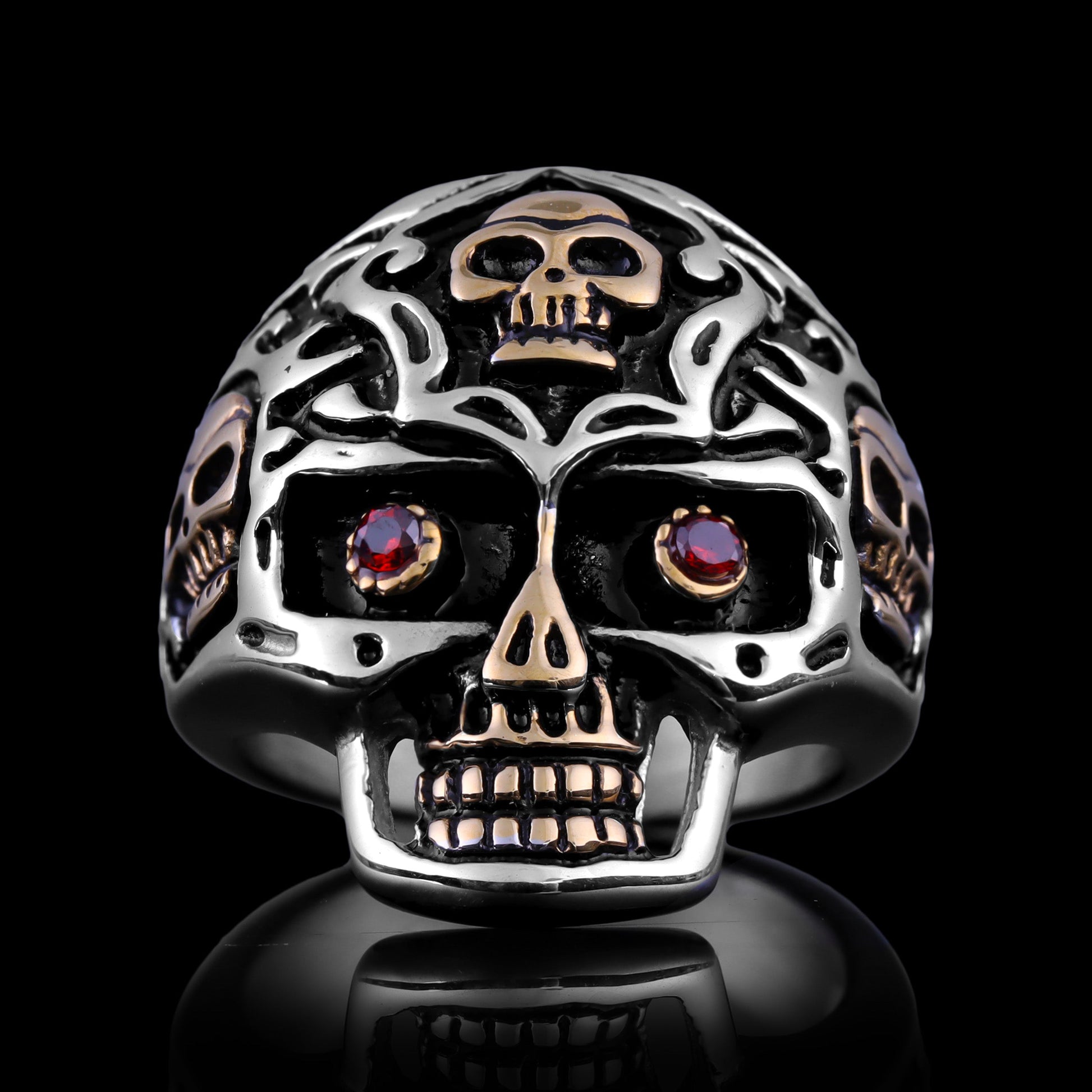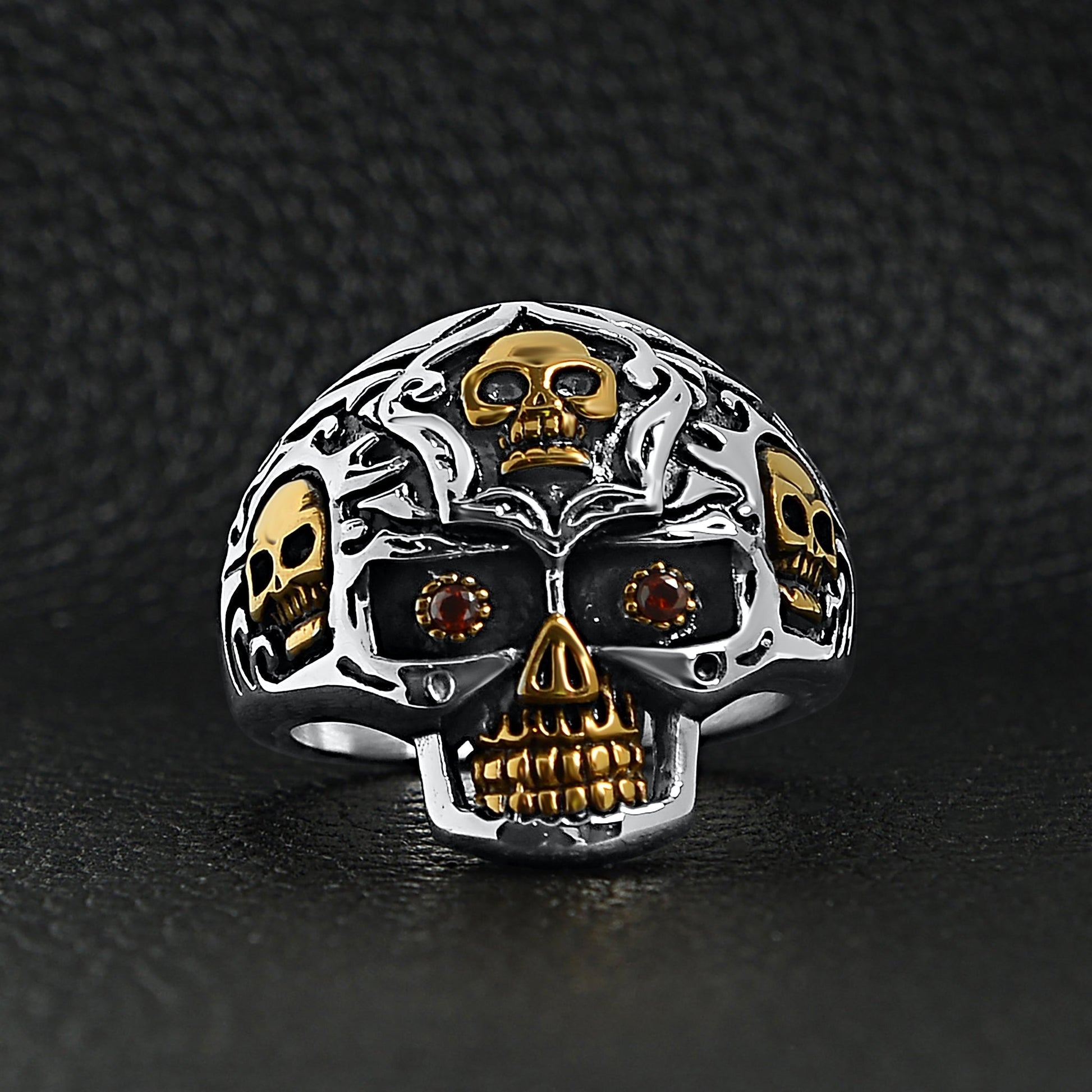 Stainless Steel 18K Gold Plated Red CZ Eyed Filigree Skull Ring