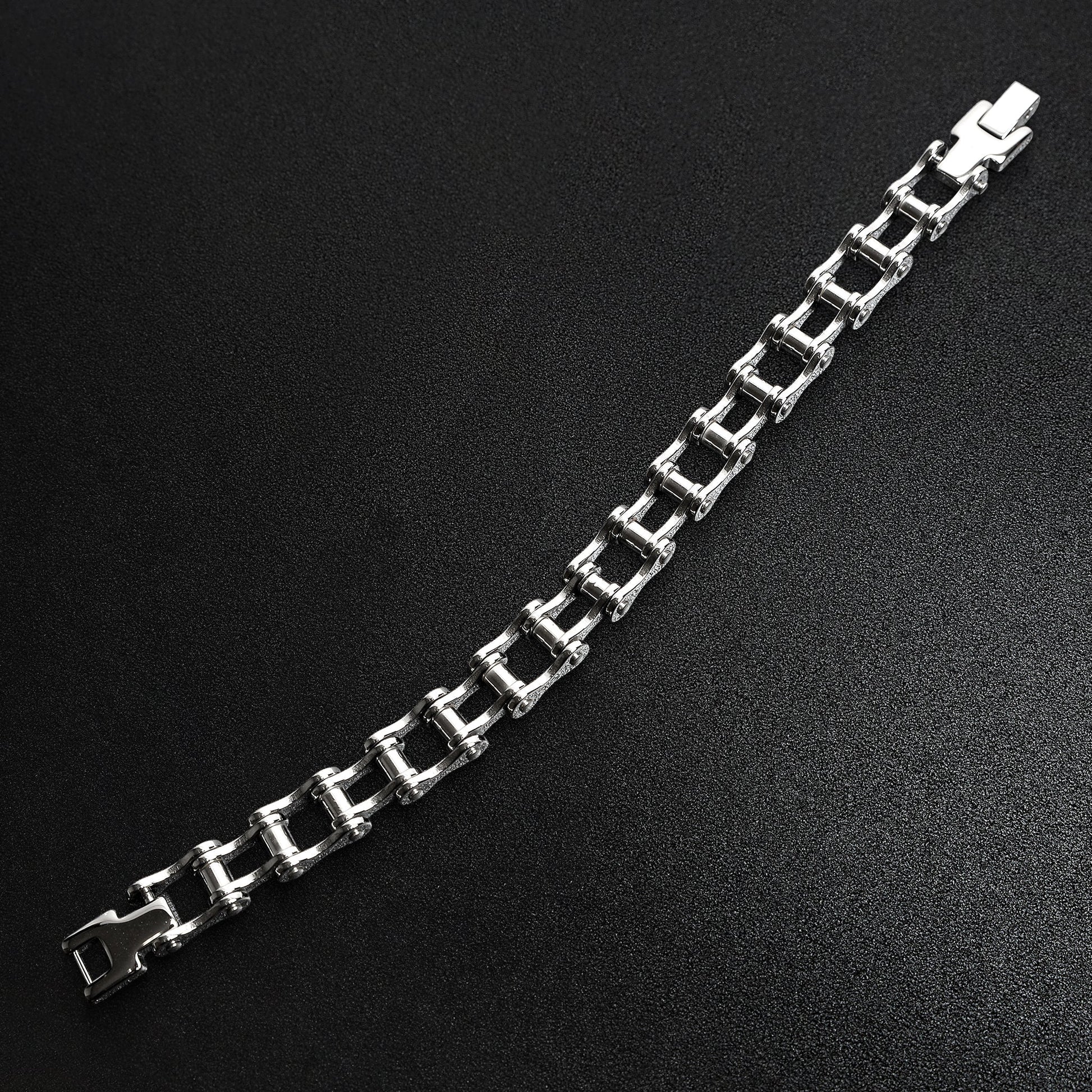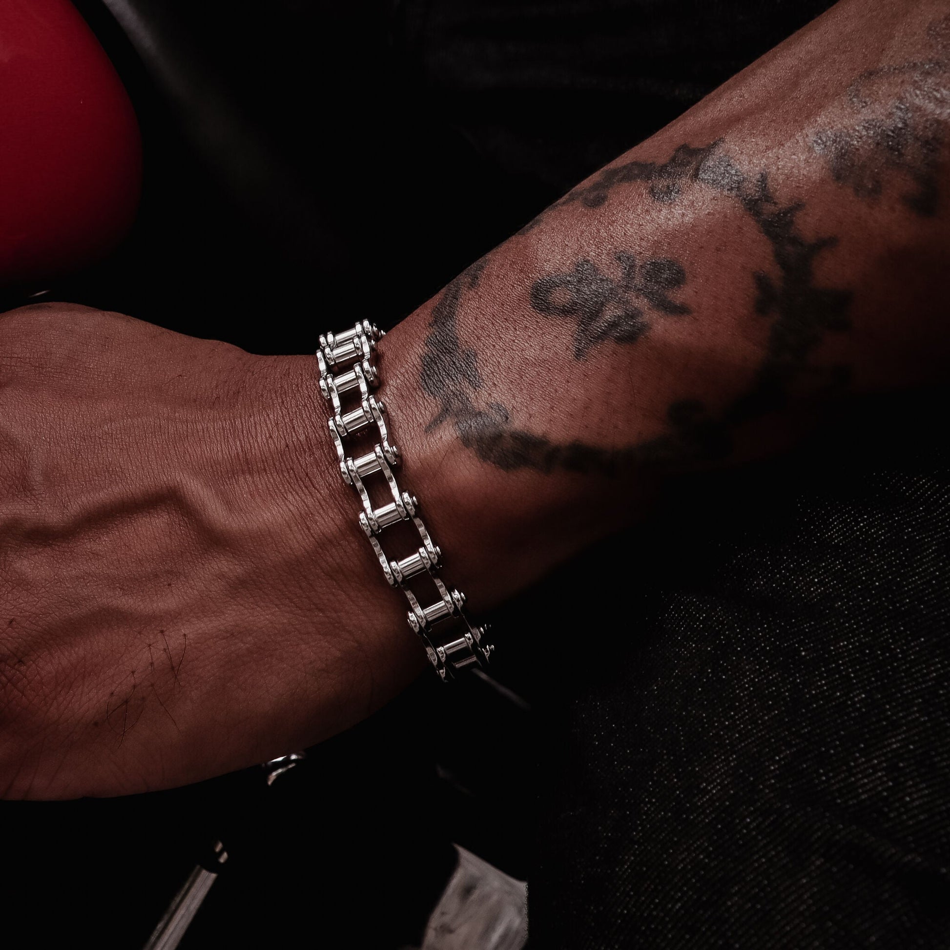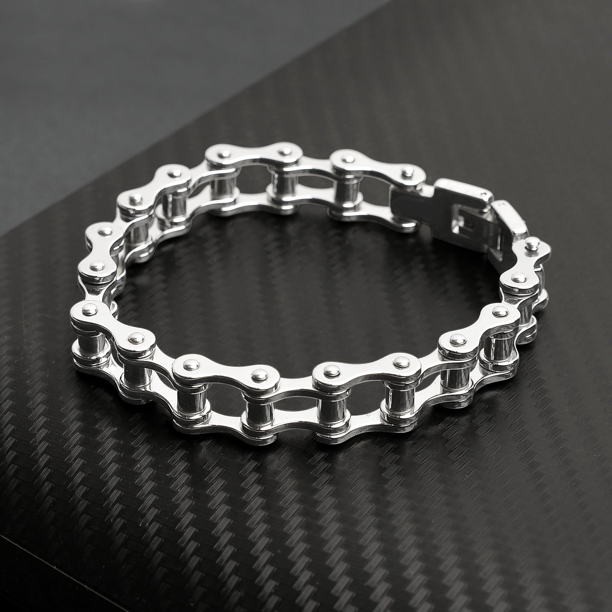 The Stainless Steel Bike Chain Bracelet from our Biker Collection is made of premium stainless steel that offers enhanced durability, even after exhaustive every day wear. The unique bike chain design combined with a polished finish makes the silver bike chain bracelet the perfect accent for every day outfits and more. Wear your new Stainless Steel Bike Chain Bracelet without worry in the water or while you sweat, all jewelry from Biker Jewelry Shop is made to last!
