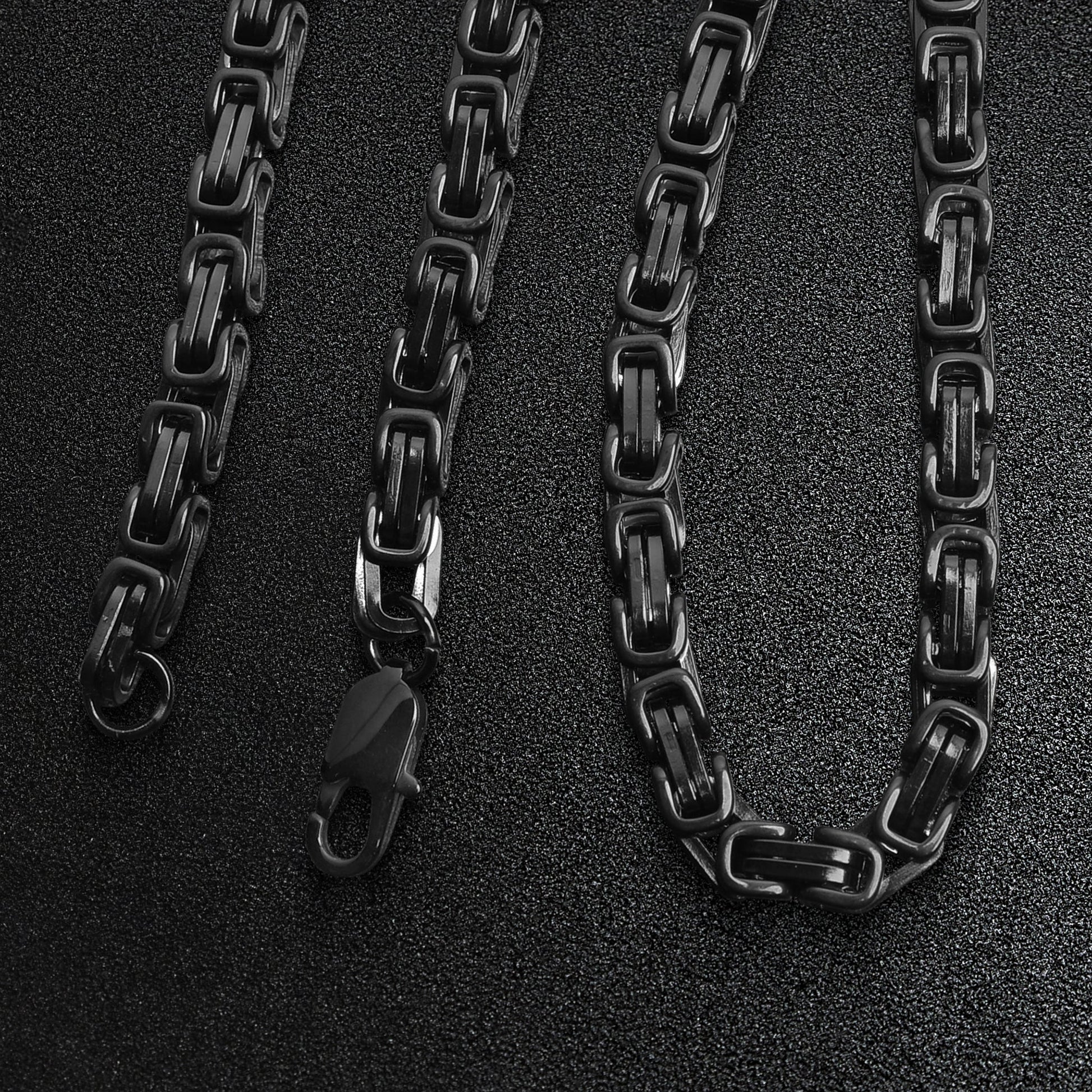 The Stainless Steel Black Byzantine Chain Necklace is a premium style piece. Made with interlocked links of polished black stainless steel in a unique Byzantine chain design, this chain necklace is a killer piece to keep in your collection. The Black Byzantine chain necklace is great for wearing alone as a bold and unique upgrade to any look. This chain is available in a variety of widths, you can choose a smaller width for a minimalist look, or choose a larger width to wear more as a statement piece. So whether you treat yourself or gift to a loved one, this unique Stainless Steel Black Byzantine Chain Necklace is a sure winner for any style for both men and women.