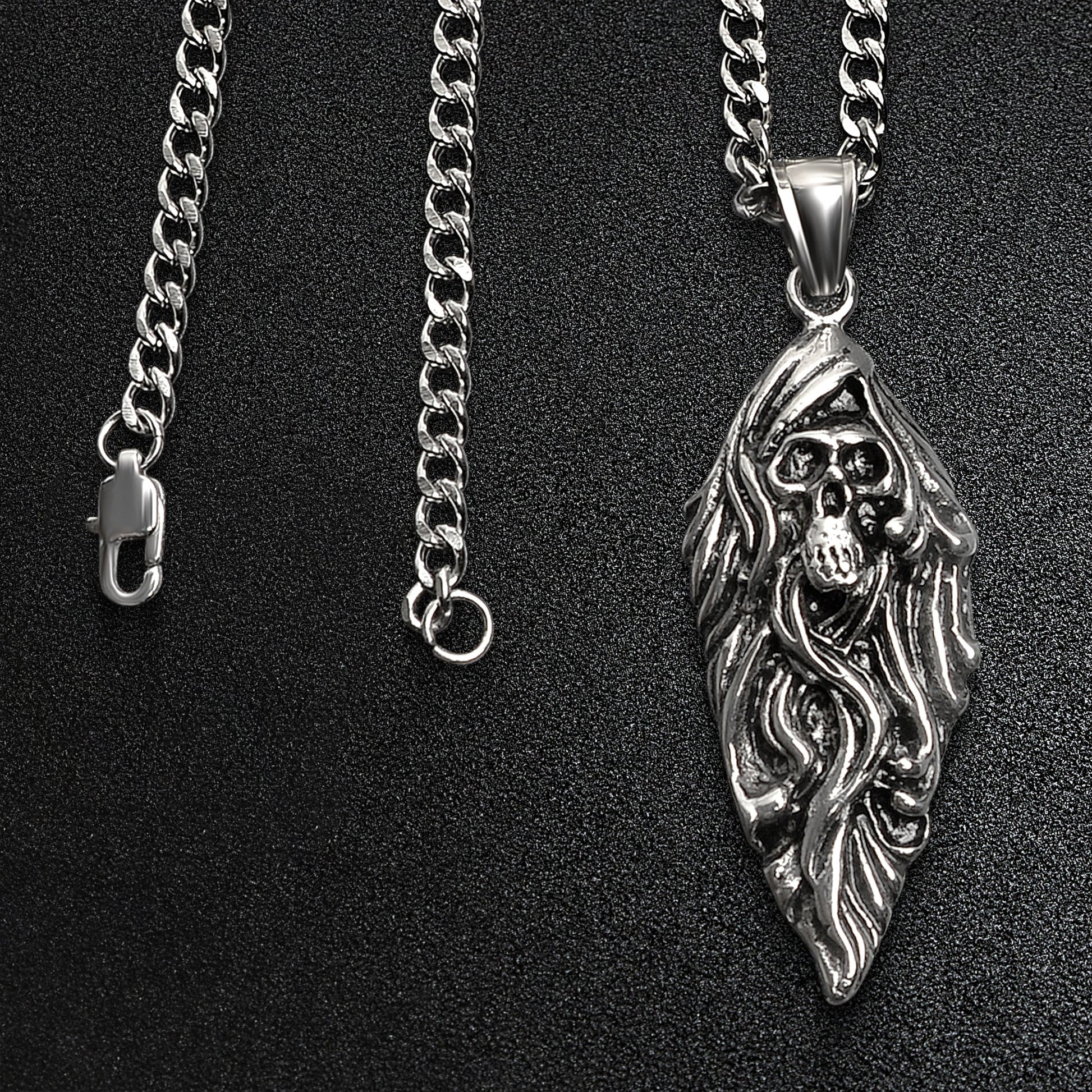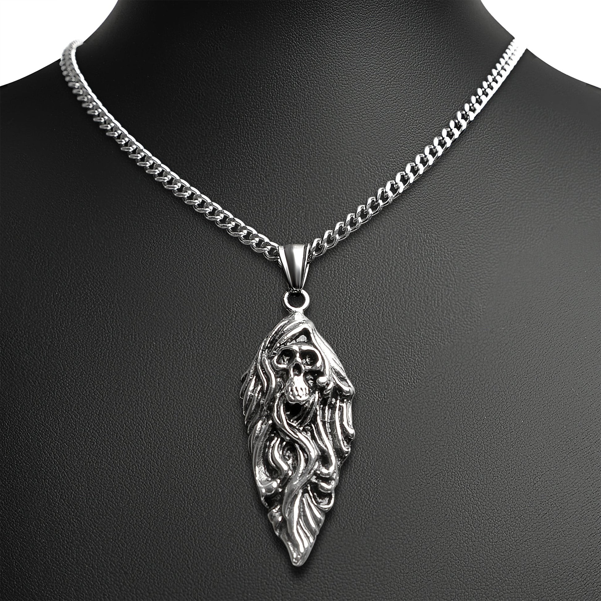 Description: Stainless Steel Flaming Skull Arrowhead Curb Chain Necklace