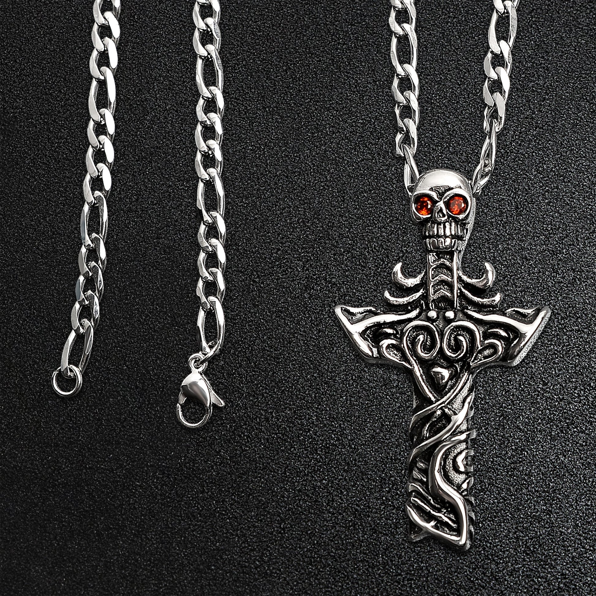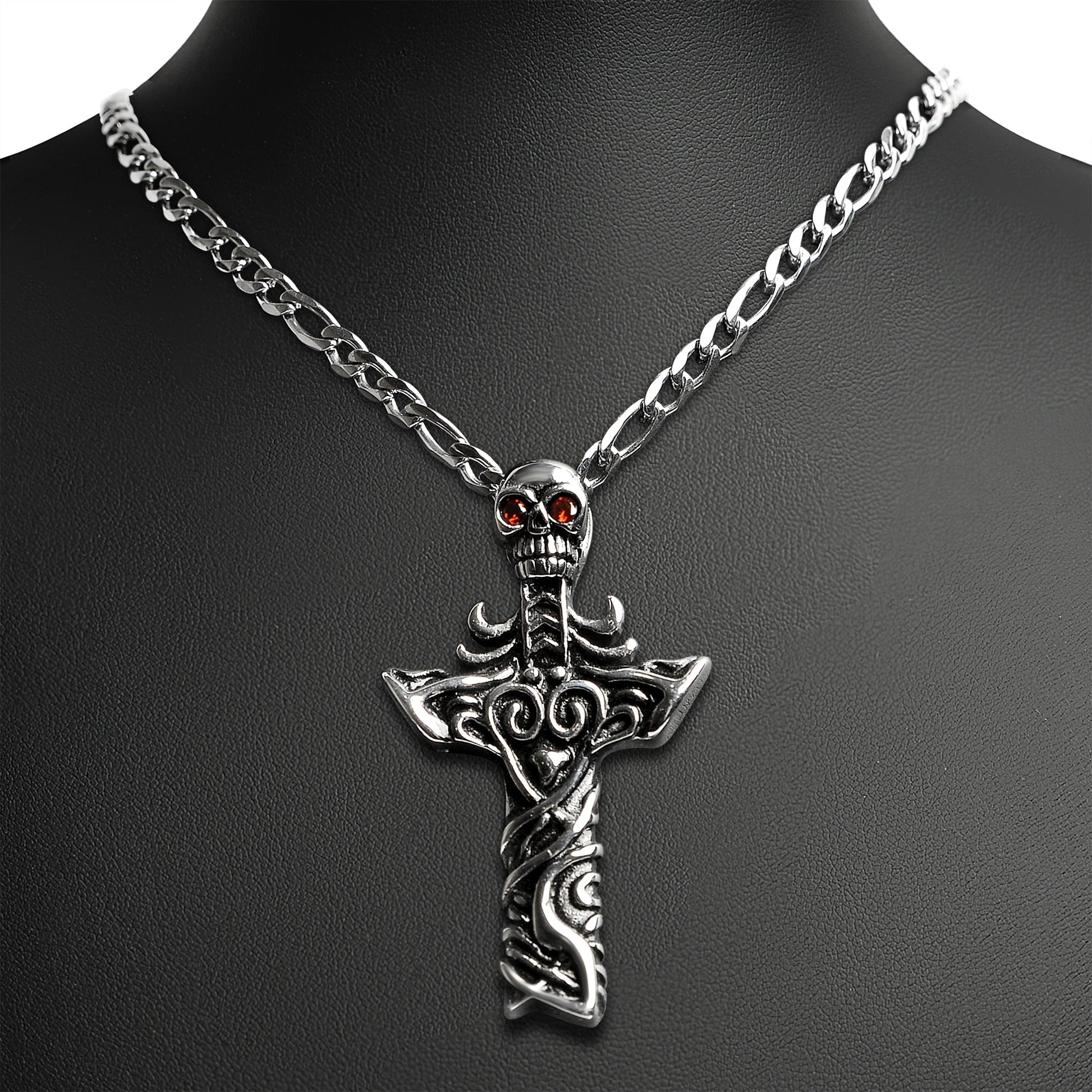 Description: Stainless Steel Red CZ Eyed Skull Cross Figaro Chain Necklace