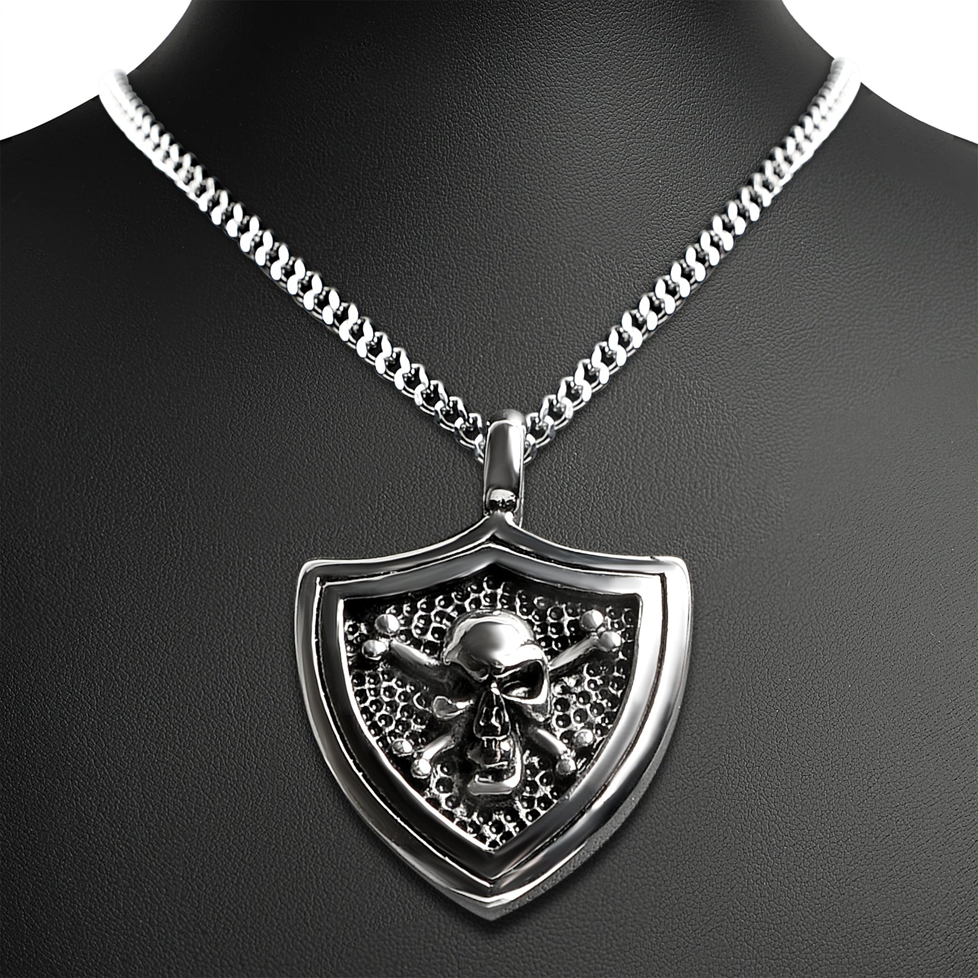 Description: Stainless Steel Skull And Crossbones Shield Curb Chain Necklace
