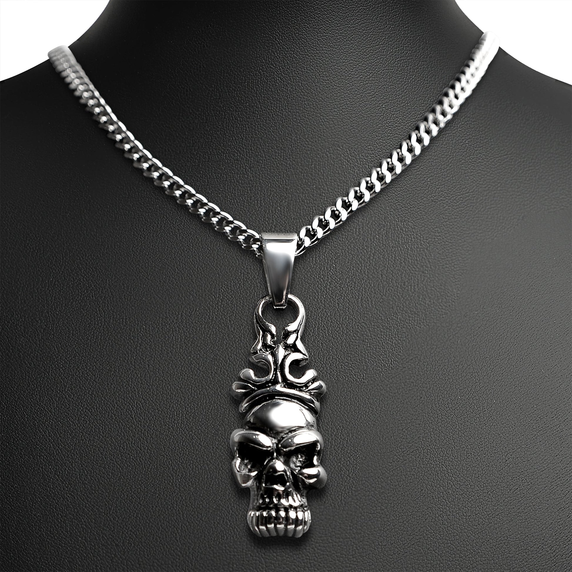 Description: Stainless Steel Skull with Filigree Crown Curb Chain Necklace