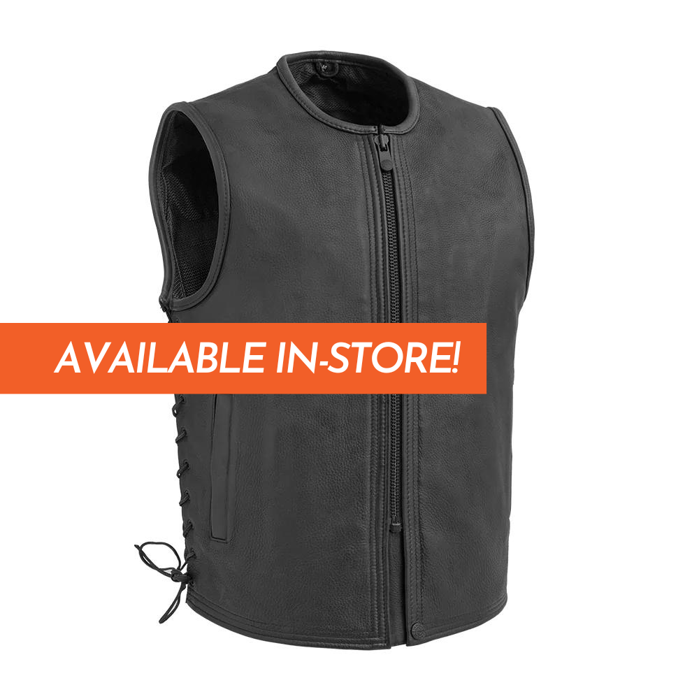 The Venom vest features a single, blacked out, visible center zipper up front with two slash pockets. It's got side lacing, making it easy to adjust the fit when seated on your motorcycle. It has mesh lining with easy access panels to add patches to the single back panel. It's crafted from Platinum Naked Cowhide, so it's heavy duty enough to give you great protection out on the road.